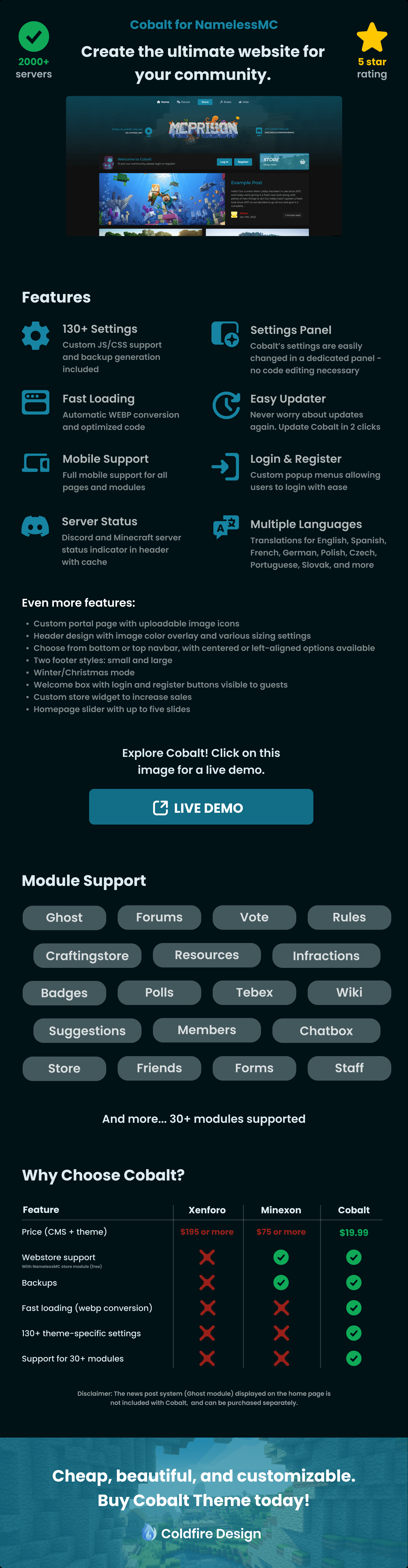The Cobalt template for the Nameless Forum is the perfect solution for people who want a state of the art website but lack of the technical know how of how to build a website. The Configurability of the template is one of the easiest i have come across and that's coming from a person with 0 coding experience. The Developer is a very friendly person who makes a point to respond to any and every technical problem you may face as well as goes out of his ways to help you with stuff even thought that's not required by him. Would 5/5 recommend this to anyone who want to have an amazing website but doesn't want to spend the 100s of USD quoted by the professional firms out there.